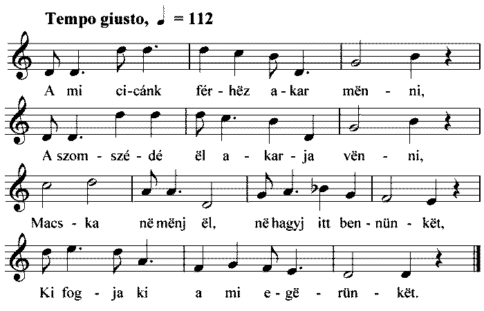 A mi cicánk férhëz akar mënni, A szoszédé ël akarja vënni, Macska në mënj ël, në hagyj itt bennünkët, Kifogja...