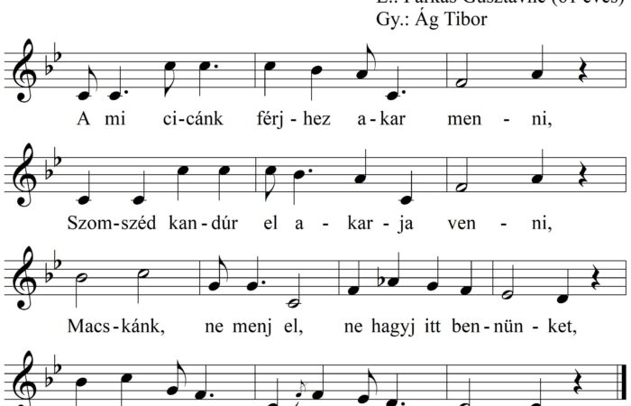 A mi cicánk férjhez akar menni, Szomszéd kandúr el akarja venni, Macskánk, ne menj, el ne hagyj itt bennünket, Ki...