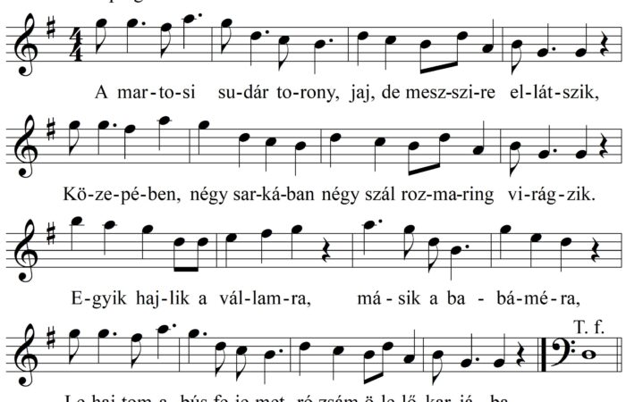 1. A martosi sudár torony, jaj, de messzire ellátszik, Közepében, négy sarkában négy szál rozmaring virágzik. Egyik hajlik a vállamra,...