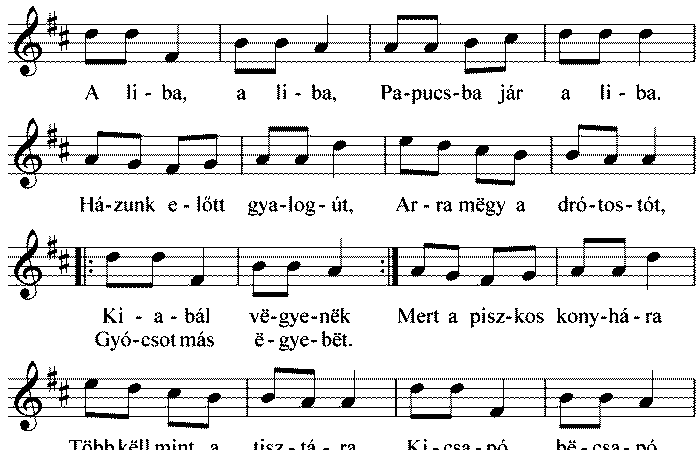 Afrikai paprika, Papucsba jár a liba A liba, a liba, Papucsba jár a liba. Házunk előtt gyalogút, Arra mëgy a...