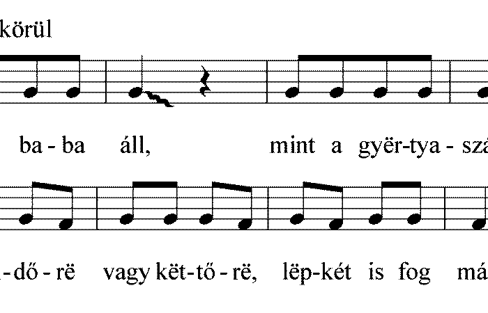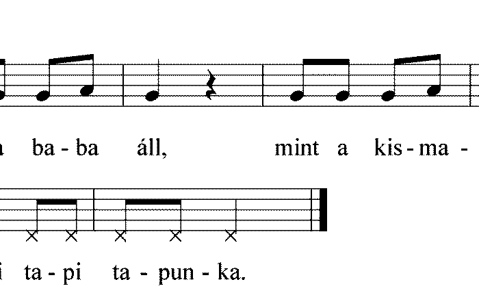 1. Áll a baba áll, mint a kismadár,Tipi tapi tapunka.