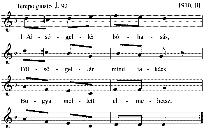 1. Alsógellér, bóhasás, Fölsőgellér mind takács. Bogya mellett elmehetsz, Bóhát öleget szedhetsz. 2. Sári lovam a fakó, Tennap hoztam Szolnokról....