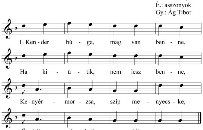 1. Kenderbuga mag van benne, Ha kiütjük nem lesz benne. Kender morzsa, szíp menyecske, Ölelj, csókolj, hogyha szeretsz. 2. Ezt...