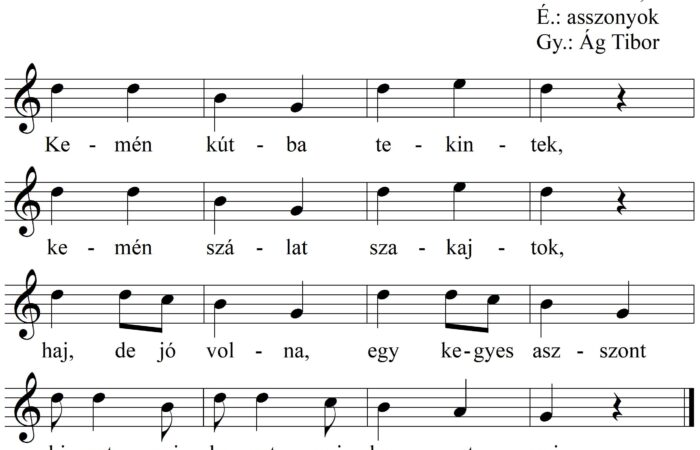 Kemén kútba tekintek, kemén szálat szakajtok, hej, de jó volna egy kegyes asszont kivetnyi, bevetnyi, kergetnyi.