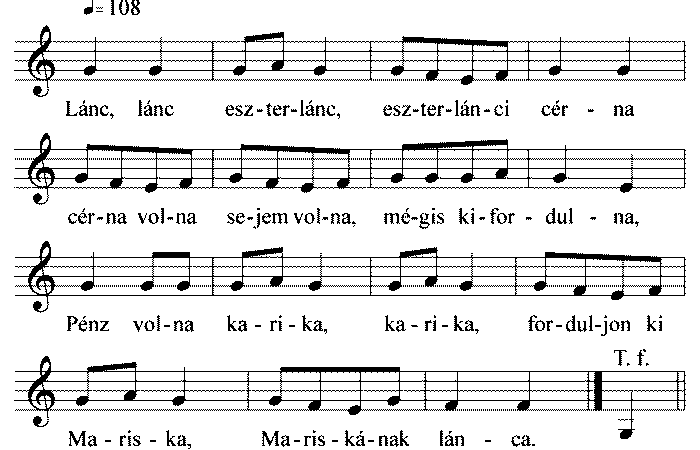 Lánc, lánc, eszterlánc, eszterlánci cérna,Cérna vóna selyem vóna, mégis kifordúna.Pénz vóna karika, karika, fordújon kiMarika, Marika, Marikának párja.