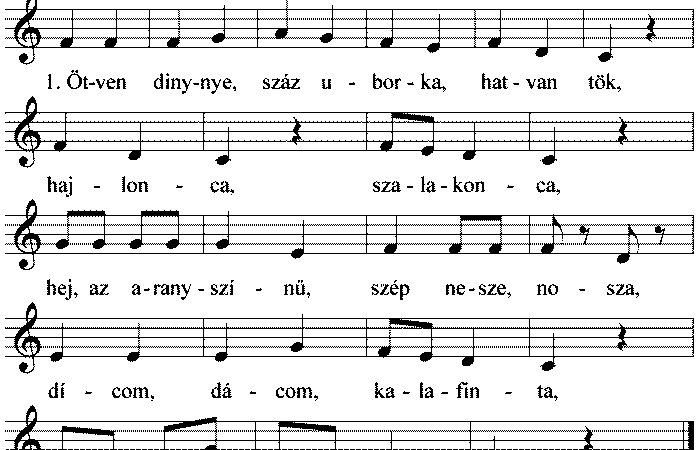 1. Ötven dinnye, száz uborka, hatvan tök, Hajlonca, szalakonca, Hej, az aranyszínű, szép nesze, nosza, Dícom, dácom, kalafinta, Előbb belekomorintja....