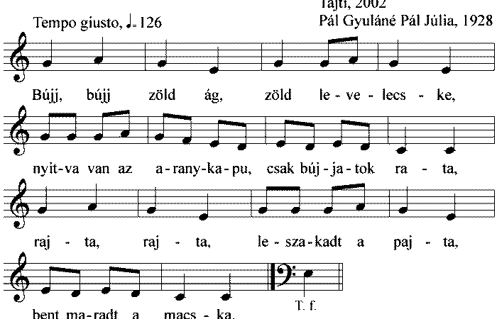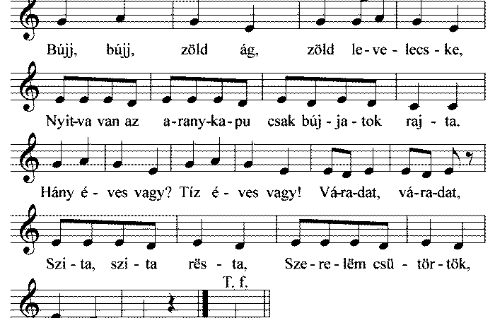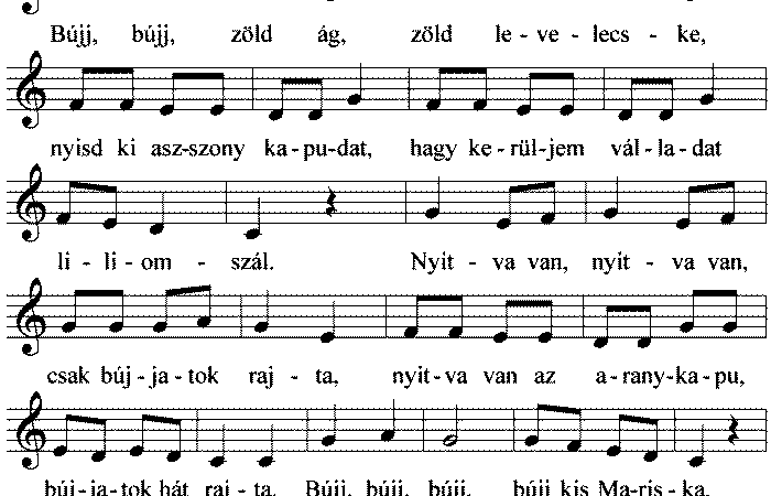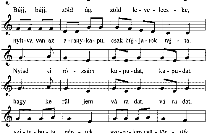 Bújj, bújj zöld ág, zöld levelecske,Nyitva van az aranykapu,Csak bújjatok rajta.Nyisd ki rózsám kapudat, kapudat,Hagy kerüljem válladat, válladat.Szita pita péntek,...
