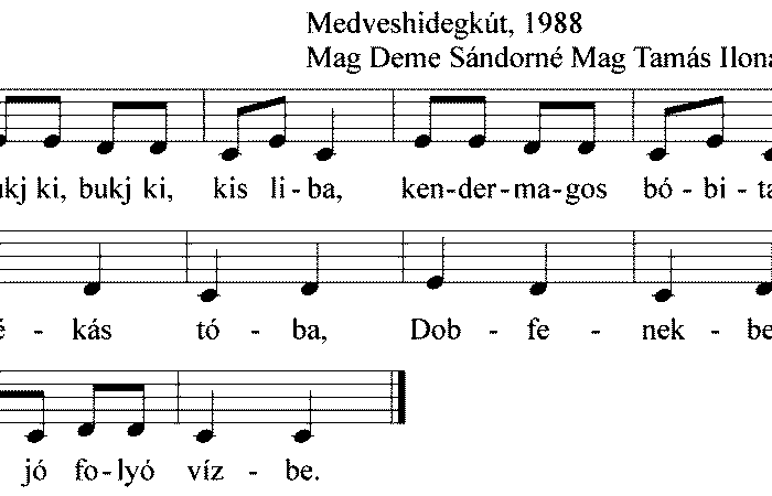 Bukj ki, bukj ki, kis liba, Kendermagos bóbita, Békás tóba, Dobfenekbe, A jó folyó vízbe.