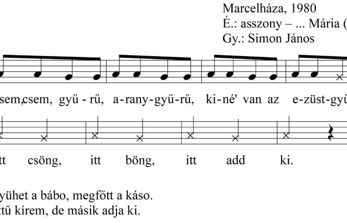 Csem, csem, gyűrű, aranygyűrű, kiné‘ van az ezüstgyűrű? Itt csöng, itt böng, itt add ki. Gyühet a bábo, megfőtt a...