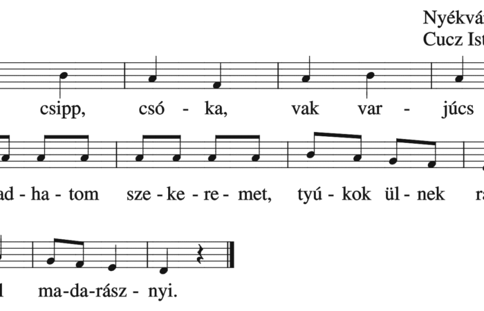 Csipp, csipp, csóka, vak varjúcska, Nem adhatom szekeremet, tyúkok ülnek rajta, Hëss el madarásznyi.
