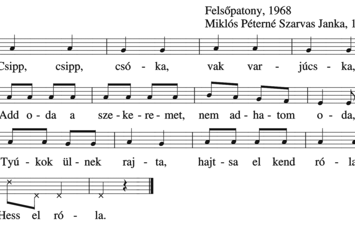 Csipp, csipp, csóka, vak varjúcska, Add oda a szekeremet, nem adhatom oda, Tyúkok ülnek rajta, hajtsa el kend róla. Hess...
