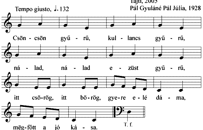 Csöm-csöm gyűrű, Kalan gyűrű,Nálam, nálam ezüst gyűrű,Kérd ki, kérd ki kisfiától,Ellenbéli szomszédjától,Itt csörög, itt pörög, itt add ki!