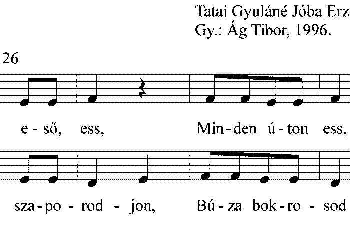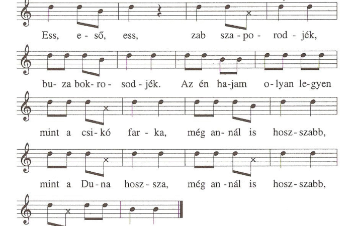 Ess, eső, ess, zab szaporodjék,Buza bokrosodjék. Az én hajam olyan legyen,Mint a csikó farka, még annál is hosszabb,Mint a Duna...