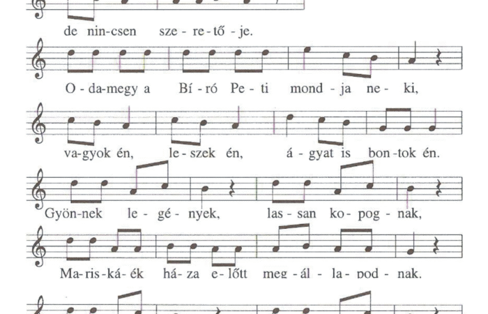 Érik a gánya, hajliak az ága, bodor a leveleA kis Mariska férjet keresne, de nincsen szeretője.Odamegy a Bíró Peti mondja...