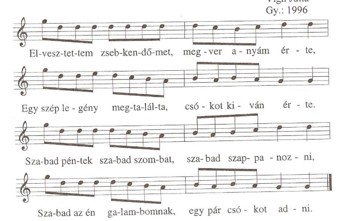 Elvesztettem zsebkendőmet, megver anyám érte, Egy szép legény megtalálta, csókot kíván érte.Szabad péntek, szabad szombat, szabad szappanozni,Szabad az én galambomnak,...