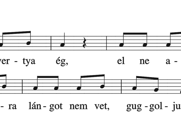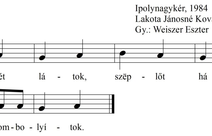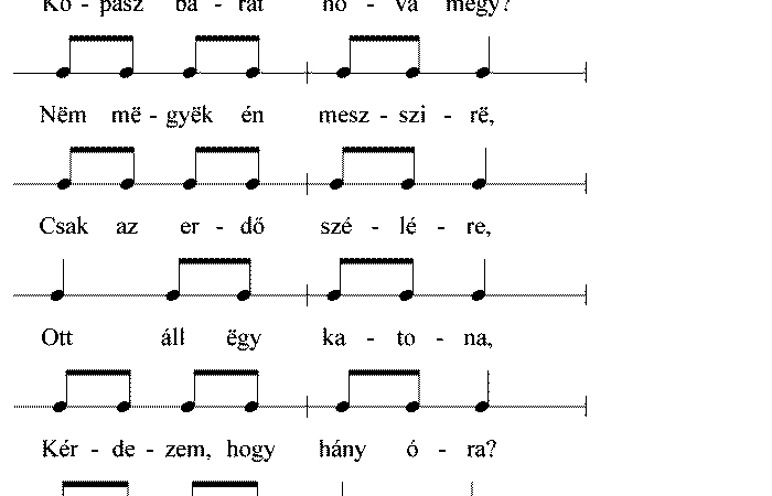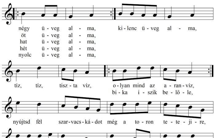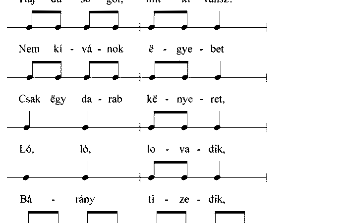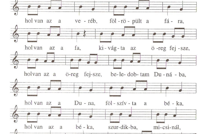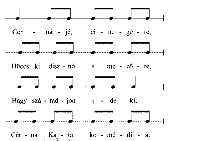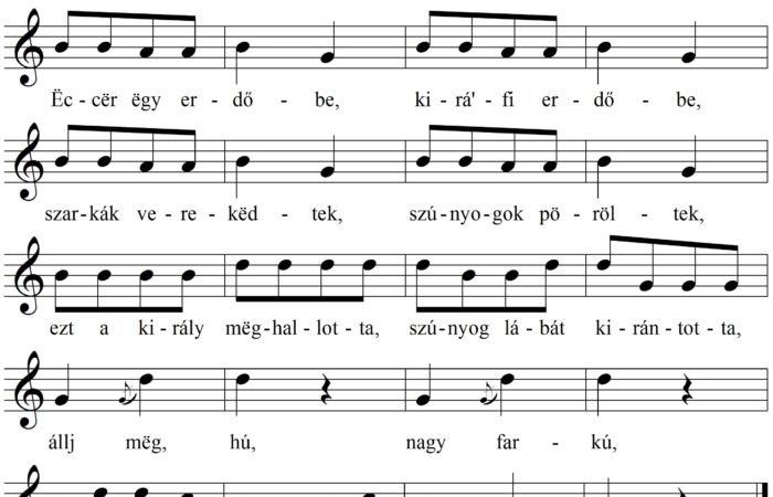 Ëccër ëgy erdőbe, kirá’fi erdőbe, szarkák verekëdtek, szúnyogok pöröltek, ezt a király mëghallotta, szúnyog lábát kirántotta, állj mëg hú, nagy farkú,...