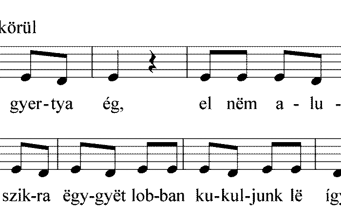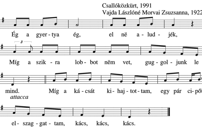 Ég a gyertya ég, el në aludjék, Míg a szikra lángot nem vet, Guggoljunk le mind. Míg a kácsát kihajtottam,...