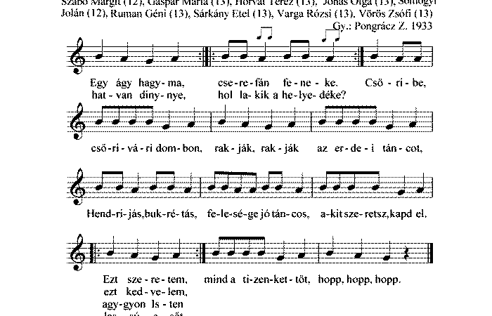 Egy ágy hagyma, hatvan dinnye, Cserefán, feneke. Hol lakik a helyedéke? Csőribe, csőrivári dombon, Rakják, rakják, az erdei táncot, Hendrijás,...