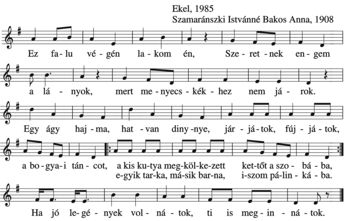 Ez a falu végén lakom én, Szeretnek engem a lányok, Mert menyecskékhez nem járok. Egy ágy hajma, hatvan dinnye, Jártátok,...