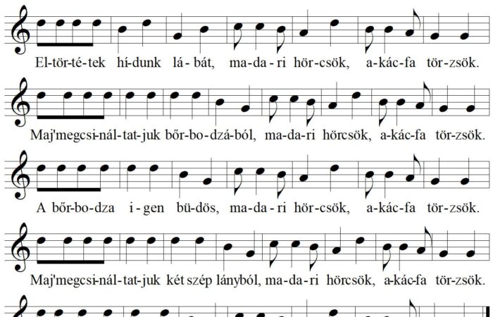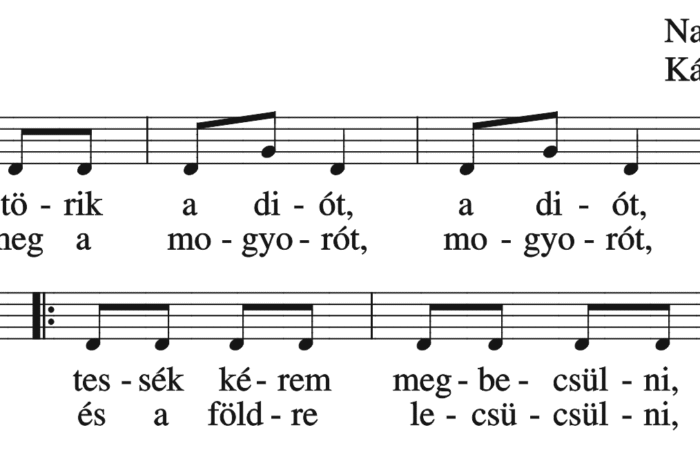 Dombon törik a diót, a diót, Földön meg a mogyorót, mogyorót, Rajta, vissza, Tessék kérem megbecsülni, És a földre lecsücsülni,...