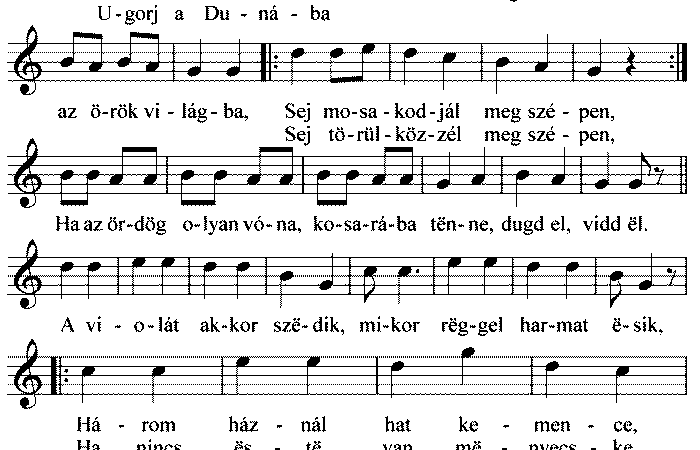Fehér liliom szál Ugorj a Dunába, Támaszd mëg oldalad, Az örök világba, Sej, mosakodjál meg szépen, Sej, törülközzél meg szépen....