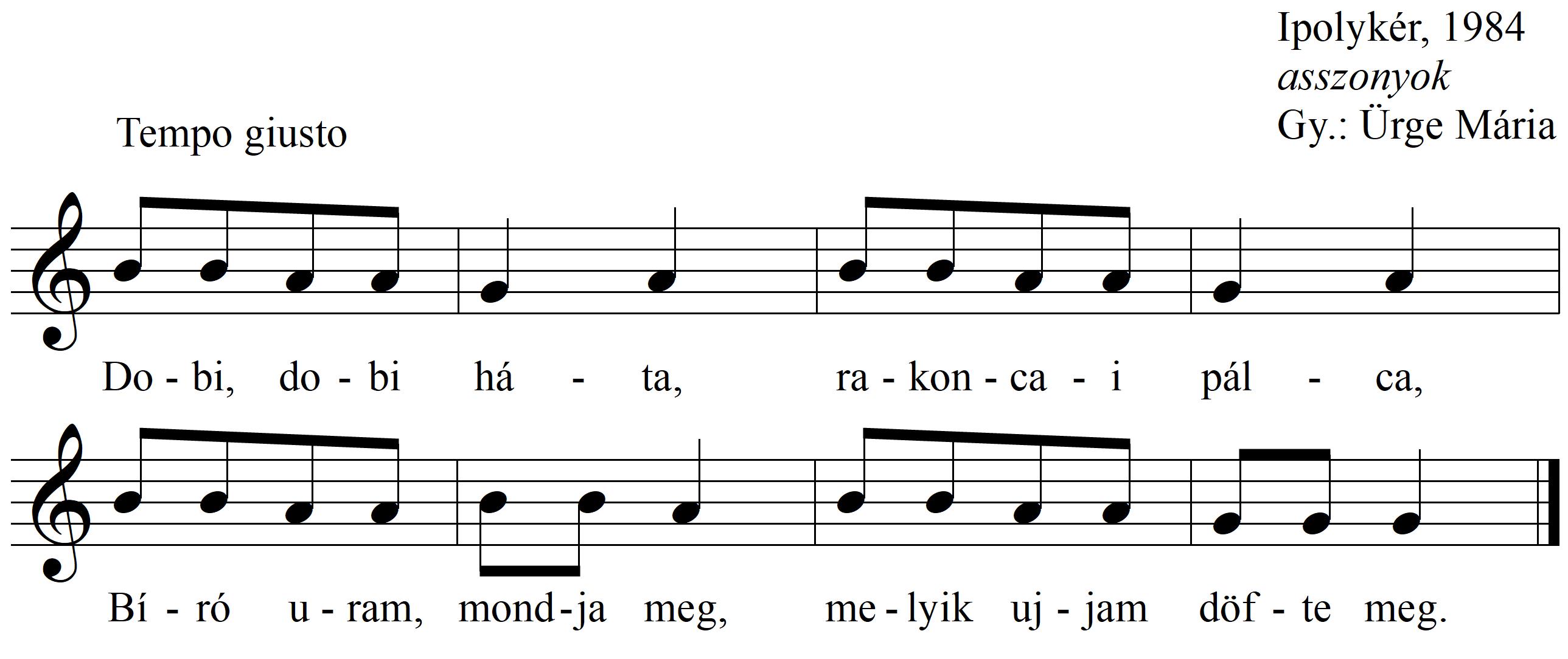 Dobi, dobi háta, Rakoncai pálca, Bíró uram, mondja meg, Melyik ujjam döfte meg.