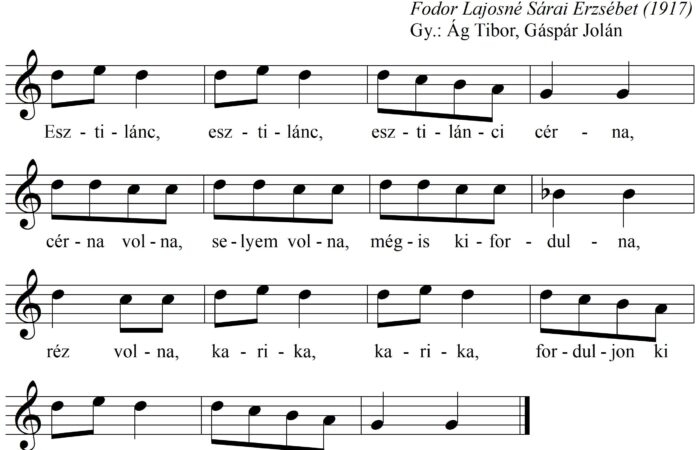 Esztilánc, esztilánc, esztilánci cérna, cérna volna, selyem volna, mégis kifordulna, réz volna, karika, karika, forduljon ki Zsuzsika, Zsuzsikának lánca.