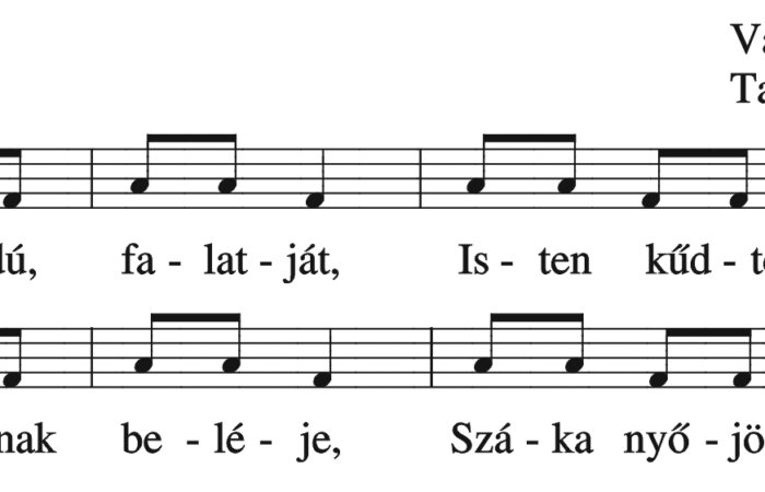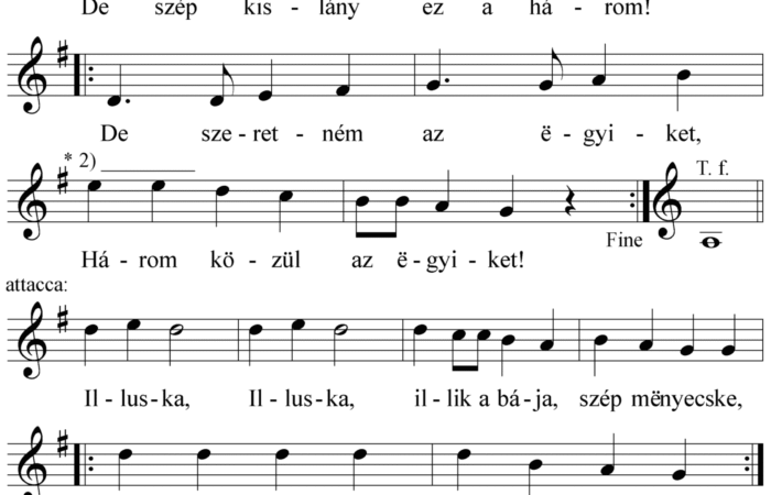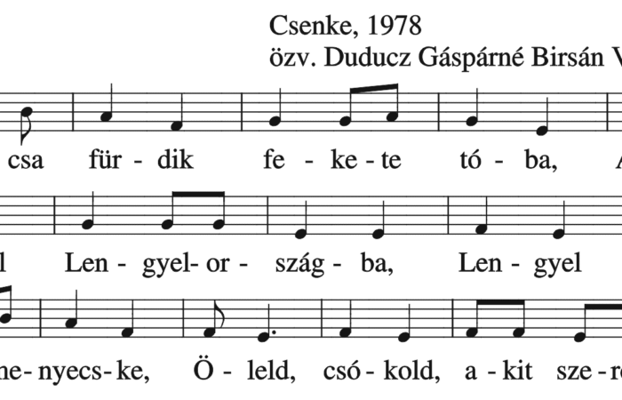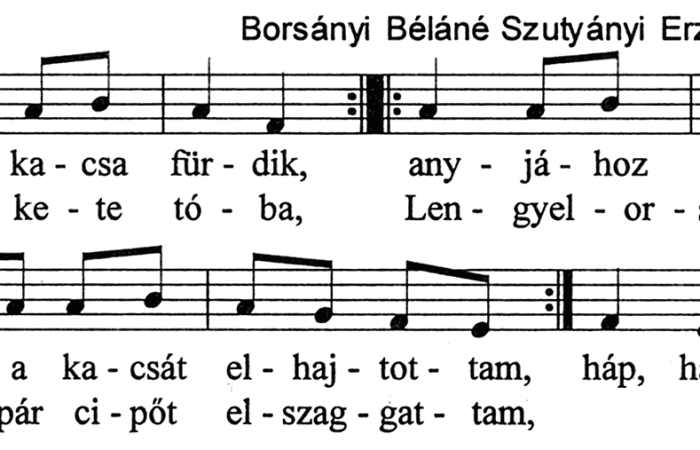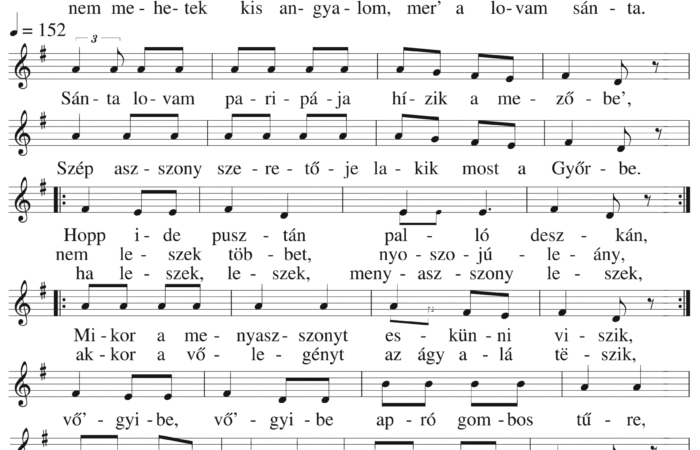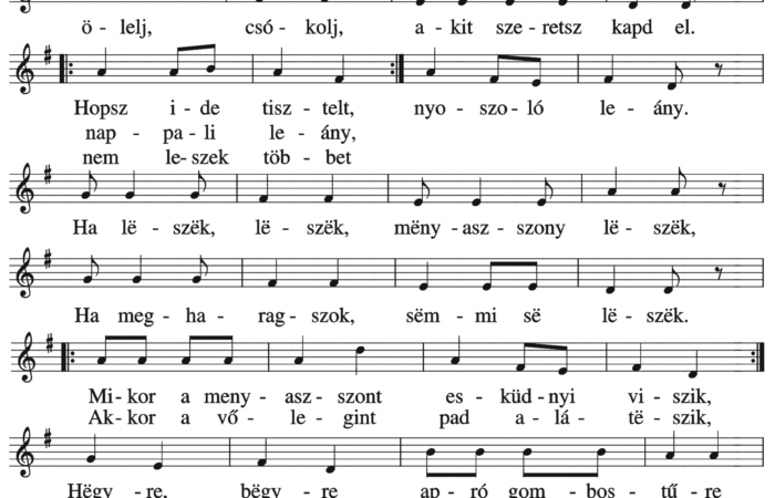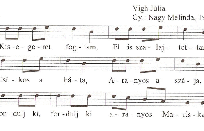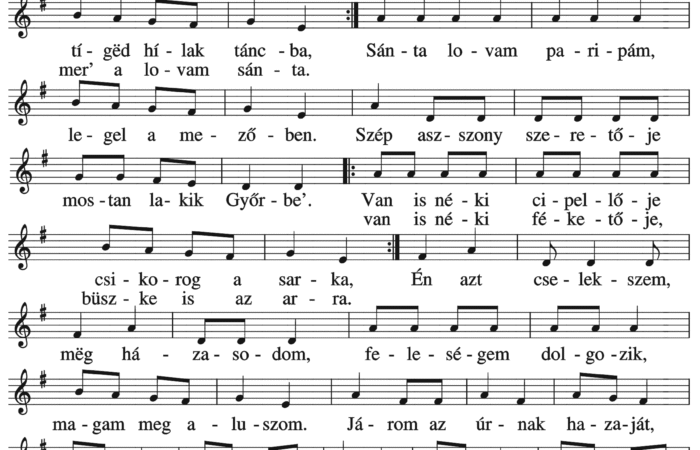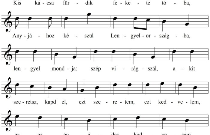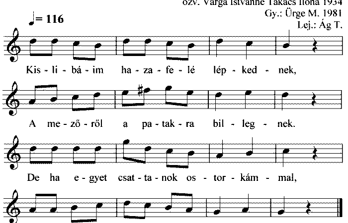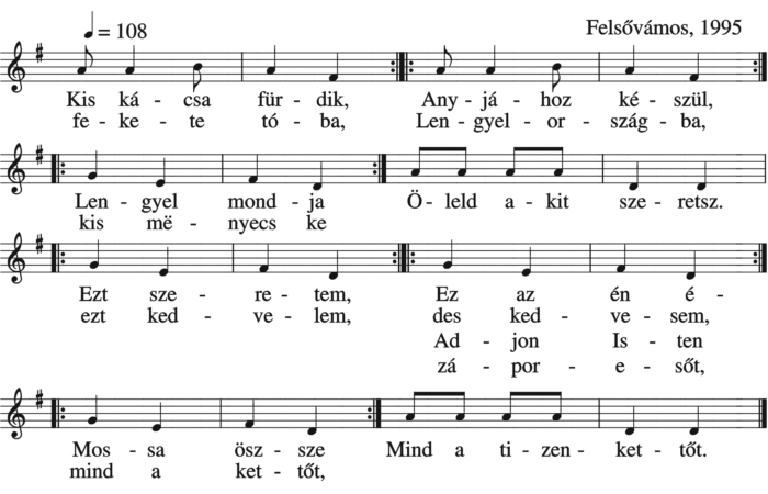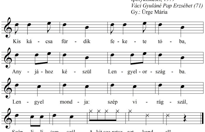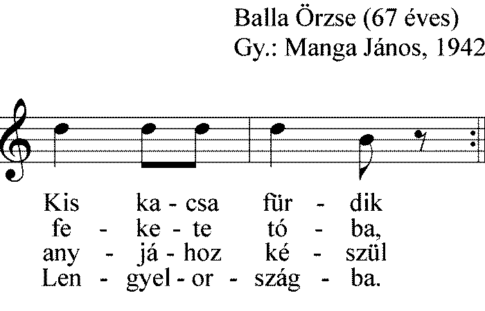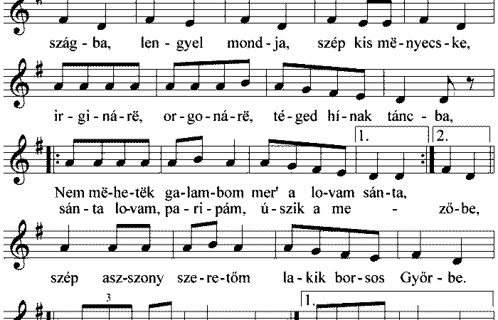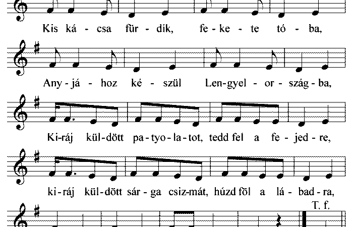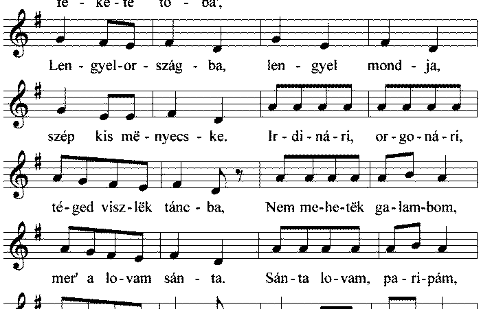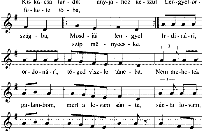 Kis kacsa fürdik fekete tóban,anyjához készül Lengyelországba.Irgináni, orgonáni, téged veszlek táncba,nem mehetek kisangyalom, mert a lovam sánta,sánta lovam paripája hízik...