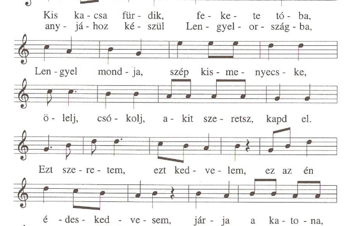 Kis kácsa fürdik fekete tóba’, anyjához készül Lengyelországba, lengyel mondja: szép virágszál, akit szeretsz, kapd el. Ezt szeretem, ezt kedvelem,...