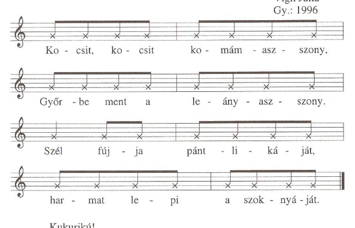 Kocsit, kocsit komámasszony,Győrbe ment a leányasszony,Szél fújja pántlikáját,Harmat lepi a szoknyáját.Kukurikú!