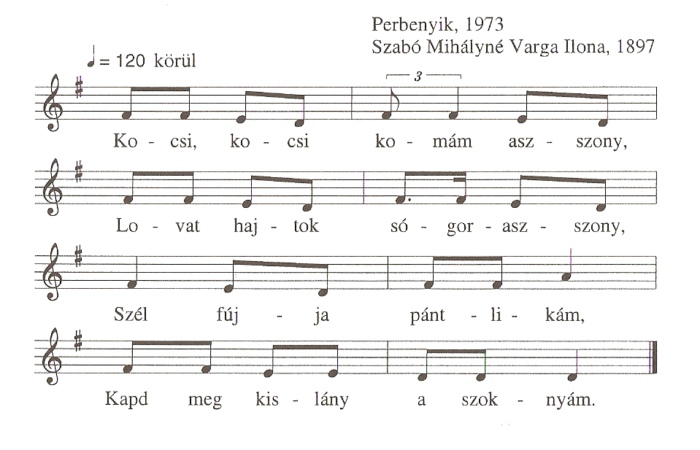 Kocsi, kocsi komám asszony,Lovat hajtok sógorasszony,Szél fújja pántlikám,Kapd meg kislány a szoknyám.
