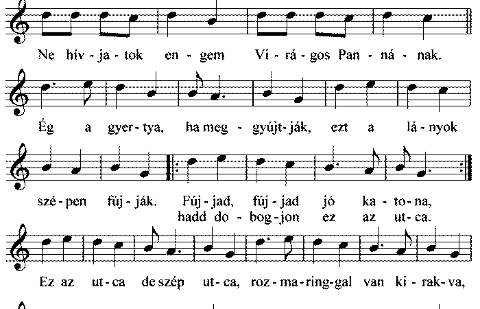 Kis kacsa fürdik, Fekete tóba, anyjához készül, Lengyelországba. Lengyel mondja szép menyecske. Ne hívjatok engem, Virágos Pannának. Ég a gyertya,...