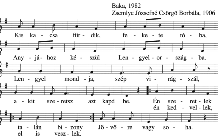 Kis kacsa fürdik, fekete tóba,Anyjához készül Lengyelországba,Lengyel mondja, szép kismenyecske,Ölelj, csókolj, akit szeretsz, kapd el.Ezt szeretem, ezt kedvelem, ez az...