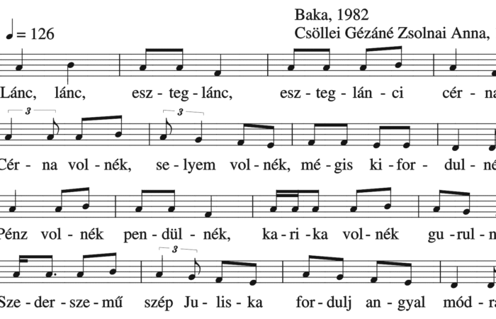 Lánc, lánc, eszteglánc, Eszteglánci cérna, Cérna volnék, selyem volnék, Mégis kifordulnék. Pénz volnék, pendülnék, Karika volnék, gurulnék, Szederszemű szép Juliska,...