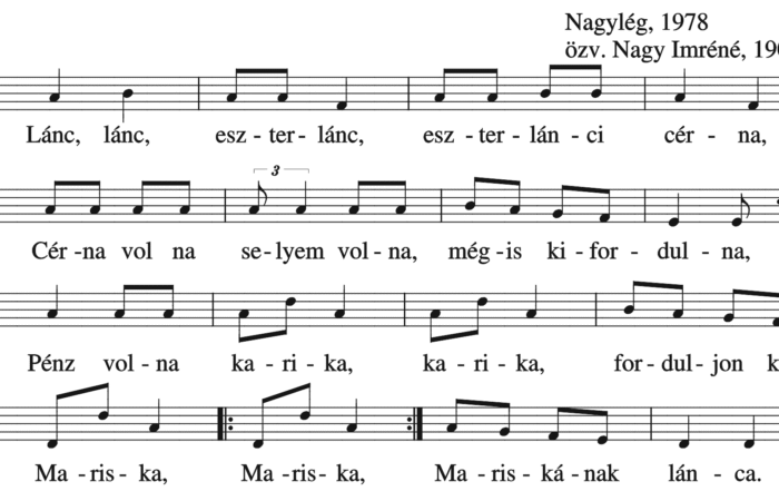 Lánc, lánc, eszterlánc, Eszterlánci cérna, Cérna volna, selyem volna, Mégis kifordulna, Pénz volna karika, karika, Forduljon ki Mariska, Mariska, Mariskának...