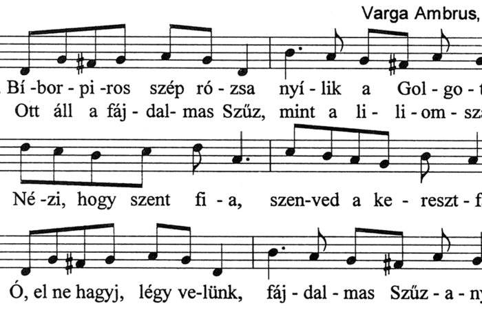 1. Bíborpiros szép rózsa nyílik a Golgotán,Ott áll a fájdalmas Szűz, mint a liliomszál.Nézi, hogy szent fia, szenved a keresztfánÓ,...