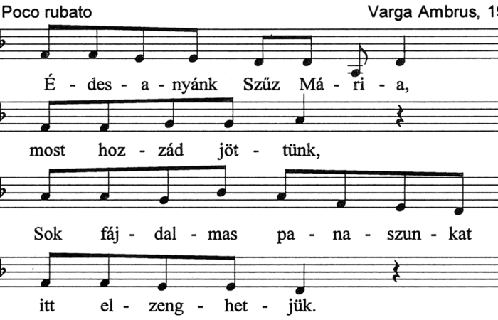 1. Édesanyánk Szűz Mária, most hozzád jöttünk,Sok fájdalmas panaszunkat itt elzenghetjük.2. Mindnyájan hozzám jöjjetek, kik keseregtek,Letörölöm a bánatos könnyeiteket. 3. Rólunk...