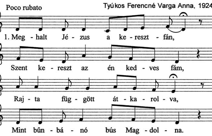 1. Meghalt Jézus a keresztfán,Szent kereszt az én kedves fám,Rajta függött átkarolva,Mint bűnbánó bús Magdolna.2. Szent fa melyen a vérbimbók,Tündököltek,...
