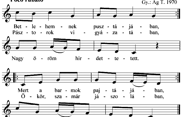 1. Betlehemnek pusztájában, Pásztorok vigyázatában, Nagy örömhír hirdettetett. Mert a barmok pajtájában, Ökör, szamár jászolában, Üdvözítőnk született. 2. Eljött úgymond...