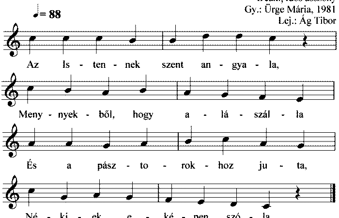 1. Az Istennek szent angyala, Mennyekből, hogy alászálla És a pásztorokhoz juta, Néki eképpen szóla. 2. Mennyből jövök most hozzátok,...