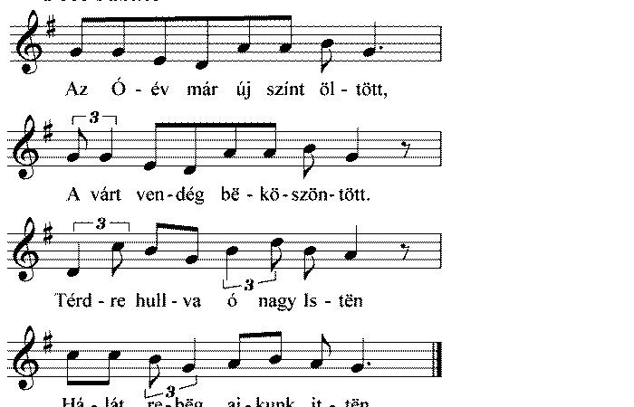 1. Az Óév már új színt öltött, A várt vendég bëköszöntött. Térdre hullva ó nagy Istën Hálát rebëg ajkunk ittën....