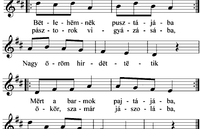 1. Bëtlehëmnëk pusztájába pásztorok vigyázásába, Nagy öröm hirdëttëtik Mërt a barmok pajtájába, ökör, szamár jászolába, Üdvözítőnk szülëtik. 2. Ó szent...