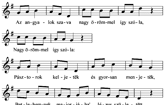 Betlehemi pusztán örvendetës hír van, Az angyalok szava nagy örömmel így szóla, Nagy örömmel így szóla: Pásztorok keljetëk és gyorsan...