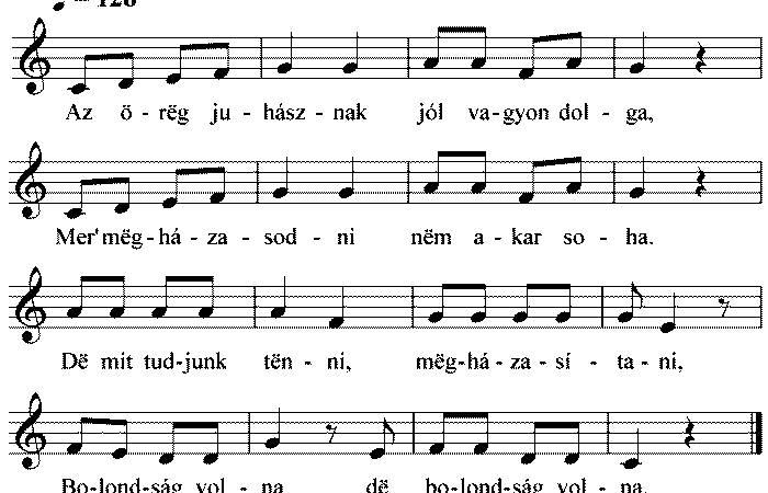 Az örëg juhásznak jól vagyon dolga, Mer’ mëgházasodni nëm akar soha. Dë mit tudjunk tënni, mëgházasítani, Bolondság volna dë, bolondság...