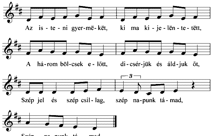 1. Az isteni gyermëkët, ki ma kijelëntetëtt, A három bölcsek előtt, dicsérjük és áldjuk őt, Szép jel és szép csillag,...
