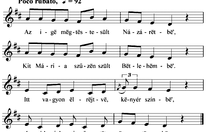 1. Az igë mëgtëstesült Názárëtbë’, Kit Mária szűzën szült Bëtlehëmbë’. Itt vagyon ëlrëjtvë, kënyér színbë’, Imádjuk mi őtët ëgyetëmbë. 2....
