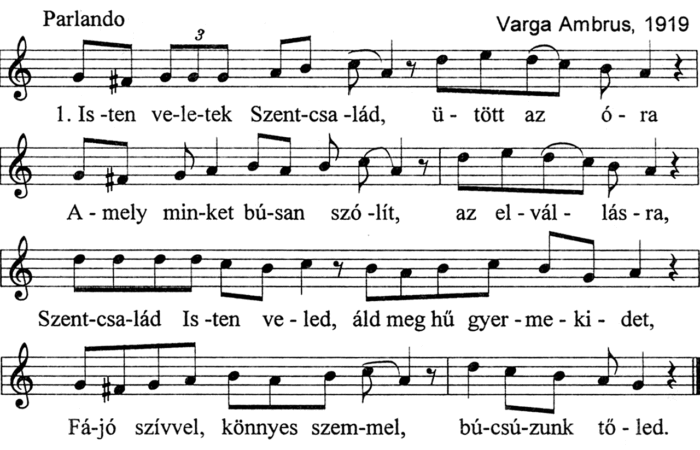1. Isten veletek Szentcsalád ütött az óraAmely minket búsan szólít az elvállásra,Szentcsalád Isten veled, áld meg hű gyermekidet,Fájó szívvel, könnyes...