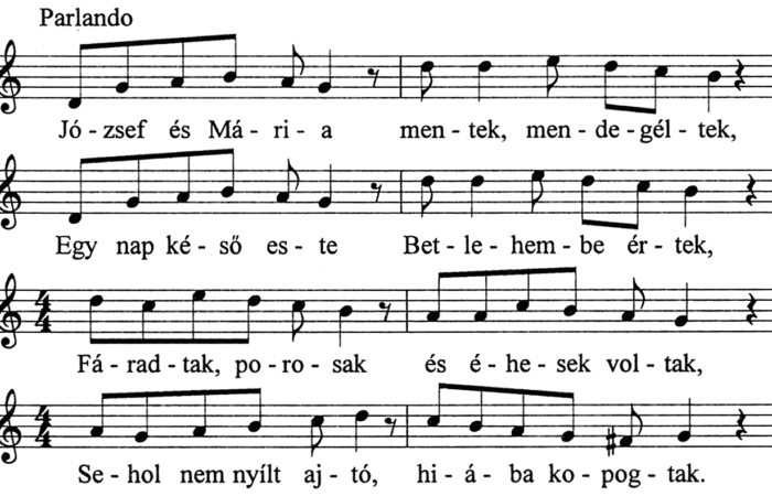 1. József és Mária mentek, mendegéltek,Egy nap késő este Betlehembe értek,Fáradtak, porosak és éhesek voltak,Sehol nem nyílt ajtó, hiába kopogtak....