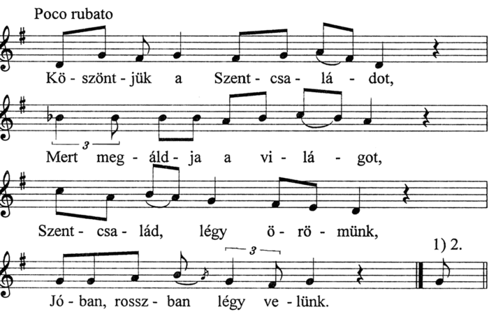 1. Köszöntjük a Szentcsaládot,Mert megáldja a világot,Szentcsalád, légy örömünk,Jóban rosszban légy velünk.2. Áld meg minden ügyeinket,Békében óvd nemzetünket,Szentcsalád, légy mi...