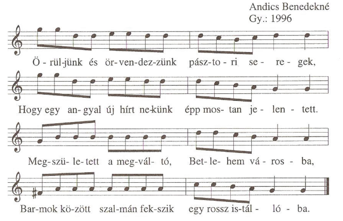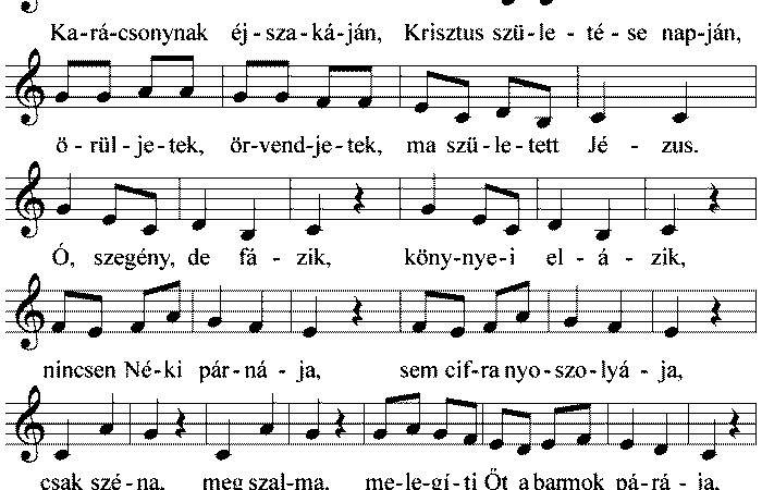 Karácsonynak éjszakáján, Krisztus születése napján, örüljetëk, örvendjetëk Mëgszületëtt Krisztus nektëk. Nëm születëtt palotába, Csak ëgy rongyos istálóba. Jaj, szëgény, de...